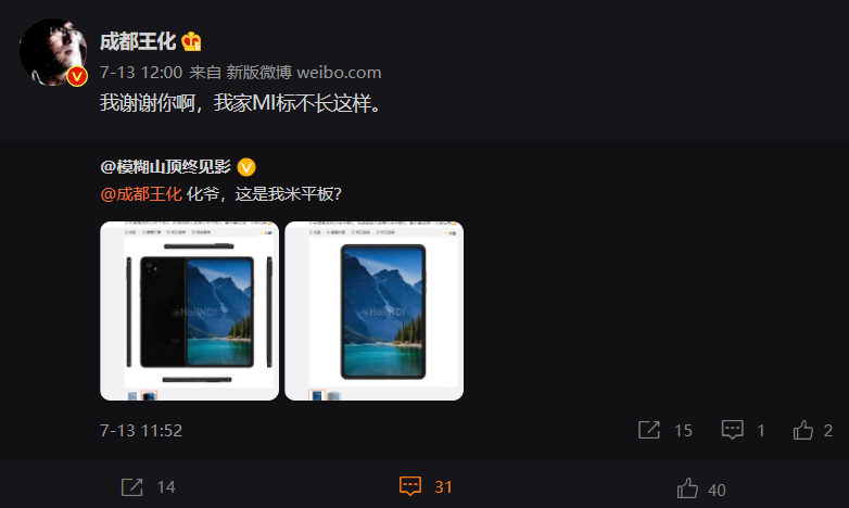 小米平板新品在年初官宣后,几乎拖了半年,都没有官方预热的消息,不过爆料大神们的信息满天飞。今日,小米公关部总经理王化在微博上回应一张网传的小米平板5渲染图,表示:“我家MI标不长这样”。