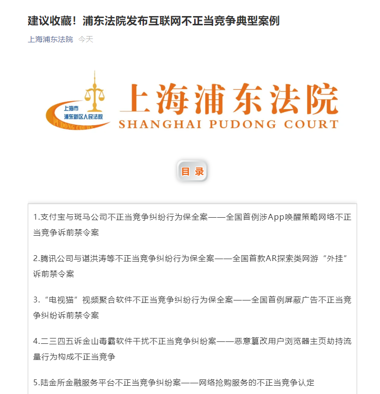 今日上海市浦东新区人民法院,在其微信公众号上发布了互联网不正当竞争典型案例,涉及到支付宝、腾讯、金山毒霸、百度、大众点评等公司,共计10起典型案例。