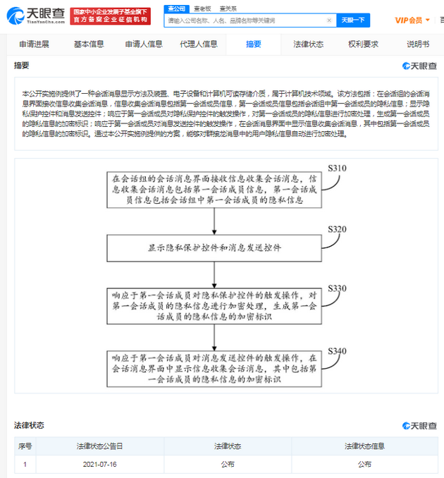 专利摘要显示,本公开实施例方法包括在会话消息界面中显示信息收集会话消息,其中包括第一会话成员的隐私信息的加密标识等。通过本公开实施例提供的方案,能够对群接龙消息中的用户隐私信息自动进行加密处理。(来源:新浪科技)