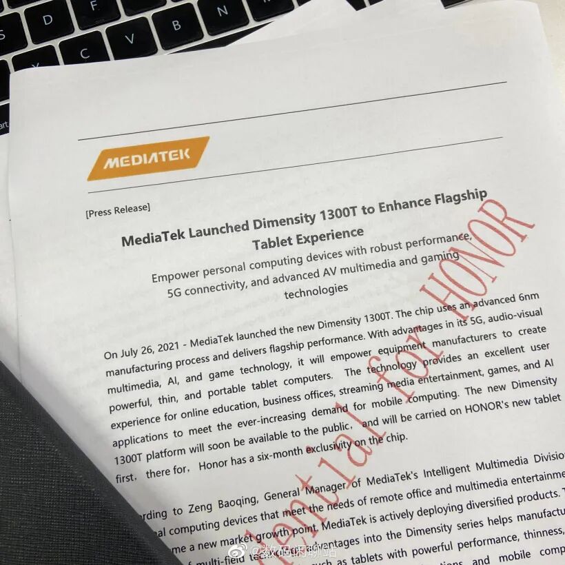 传荣耀平板V7 Pro首发天玑1300T