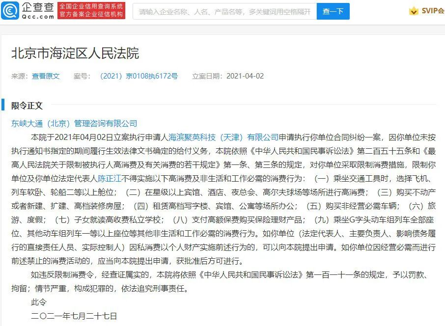 7 月 28 日消息,ofo 关联公司东峡大通(北京)管理咨询有限公司等执行裁定书在 7 月 27 日公开,申请执行人为海滨聚英科技(天津)有限公司。