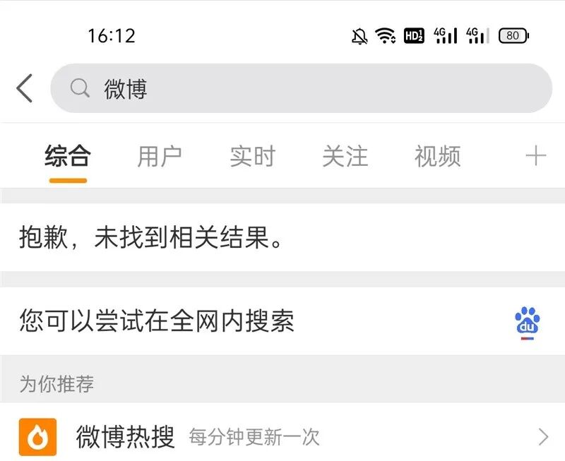 而实际上微博 App 的搜索功能也已经崩溃,提示“抱歉,未找到相关结果。您可以尝试在全网内搜索。”