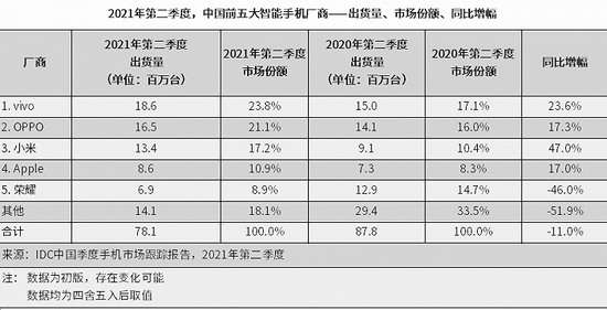 7月28日,国际数据公司(IDC)手机季度跟踪报告显示,2021年第二季度中国智能手机市场出货量约7810万台,同比下降11.0%。