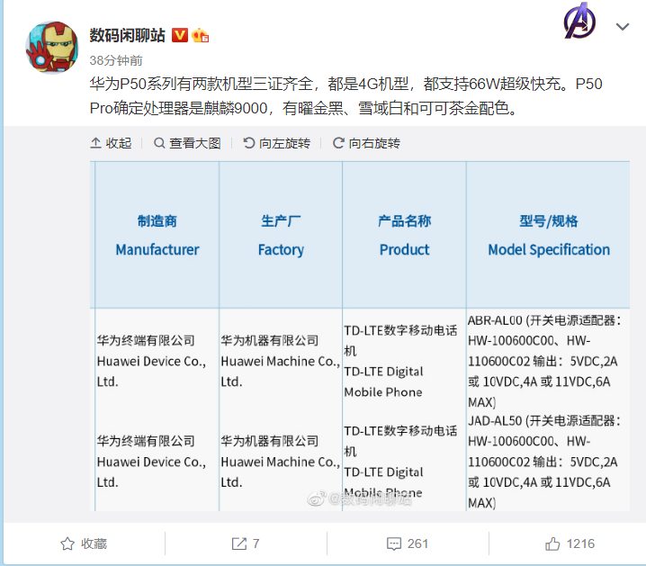7 月 27 日消息,华为此前宣布将于 7 月 29 日举办华为旗舰新品发布会,正式发布华为 P50 系列等产品。据微博博主 @数码闲聊站 称,华为 P50 系列有两款机型三证齐全,都是 4G 机型,都支持 66W 超级快充。P50 Pro 确定处理器是麒麟 9000,有曜金黑、雪域白和可可茶金配色。