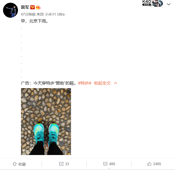 雷军微博晒鞋,免费“代言”国产品牌