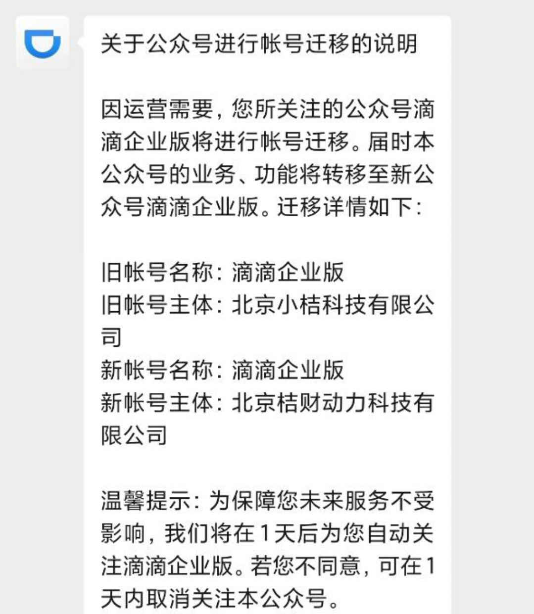 有网友发现,滴滴企业版公众号的主体企业现从“北京小桔科技有限公司”迁移到“北京桔财动力科技有限公司”。