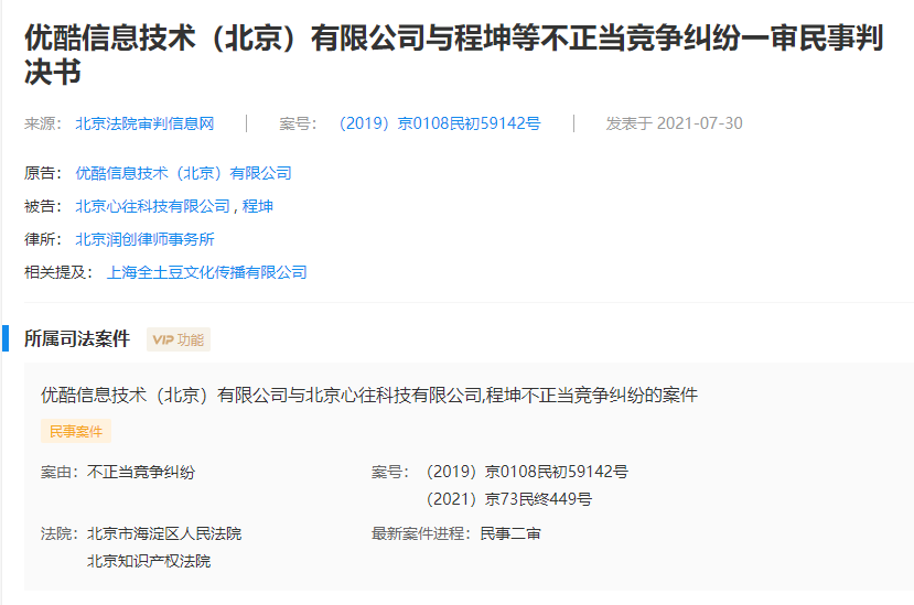 优酷信息技术(北京)有限公司与北京心往科技有限公司的不正当竞争纠纷一审民事判决书在近日公开。