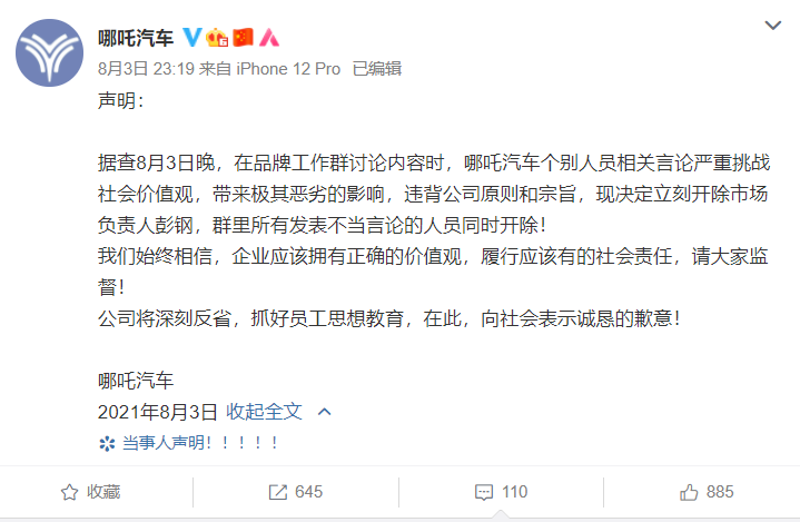 声明指出,8 月 3 日晚,在品牌工作群讨论内容时,哪吒汽车个别人员相关言论严重挑战社会价值观,带来极其恶劣的影响,违背公司原则和宗旨。