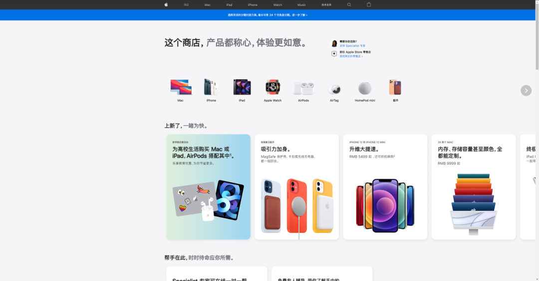 经过短时间维护后,苹果 Apple Store 在线商店现已恢复,并带来了全新的 UI 设计。此外,苹果官网主页导航栏新增了一项“商店”按钮,可以直达苹果在线商店。