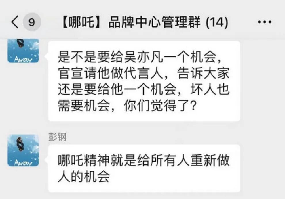 据新浪科技报道,此前有哪吒员工在工作群中表示“要给吴亦凡一个机会,官宣请他做代言人。”(来源:IT之家)