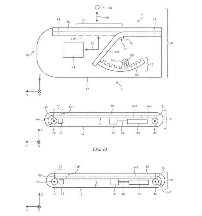 在苹果这项专利当中,一种机制可以将柔性显示屏的一部分弯曲出来。该专利提到了一个指定的区域作为开放和关闭状态的窗口区域。显示屏的可移动部分根据状态在两个位置之间切换,全部工作在外部玻璃罩下完成。