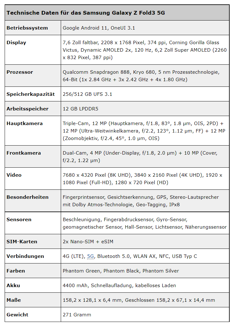 据悉,这款手机将搭载高通骁龙888处理器,标配8GB LPDDR5内存,相比12GB的Z Fold3机型有所减小。手机搭载UFS 3.1闪存,有128GB、256GB可选。
