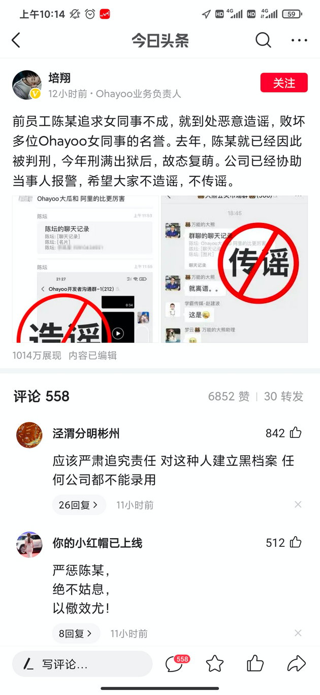 培翔表示:“前员工陈某追求女同事不成,就到处恶意造谣,败坏多位Ohayoo女同事的名誉。去年,陈某就已经因此被判刑,今年刑满出狱后,故态复萌。公司已经协助当事人报警,希望大家不造谣,不传谣。”(来源:新浪科技)