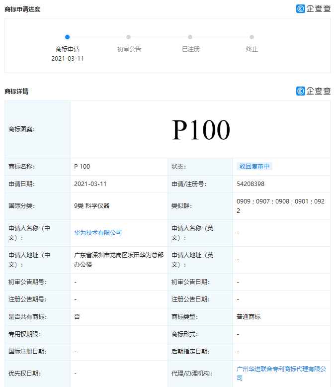 近日,华为技术有限公司“P100”商标状态变更为驳回复审,商标国际分类涉 9 类 科学仪器等。