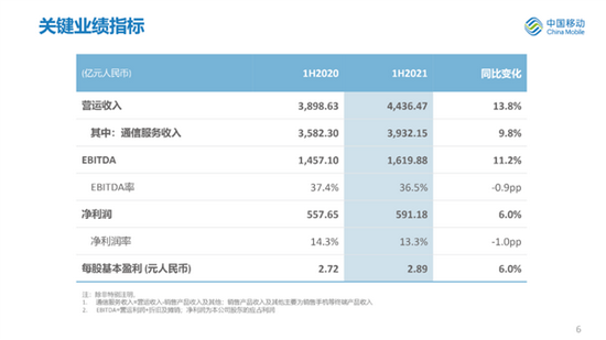8月12日,中国移动公布2021年中期业绩。2021年上半年,中国移动营运收入达到人民币4436亿元,同比增长13.8%,上半年平均每天营收24.37亿元。