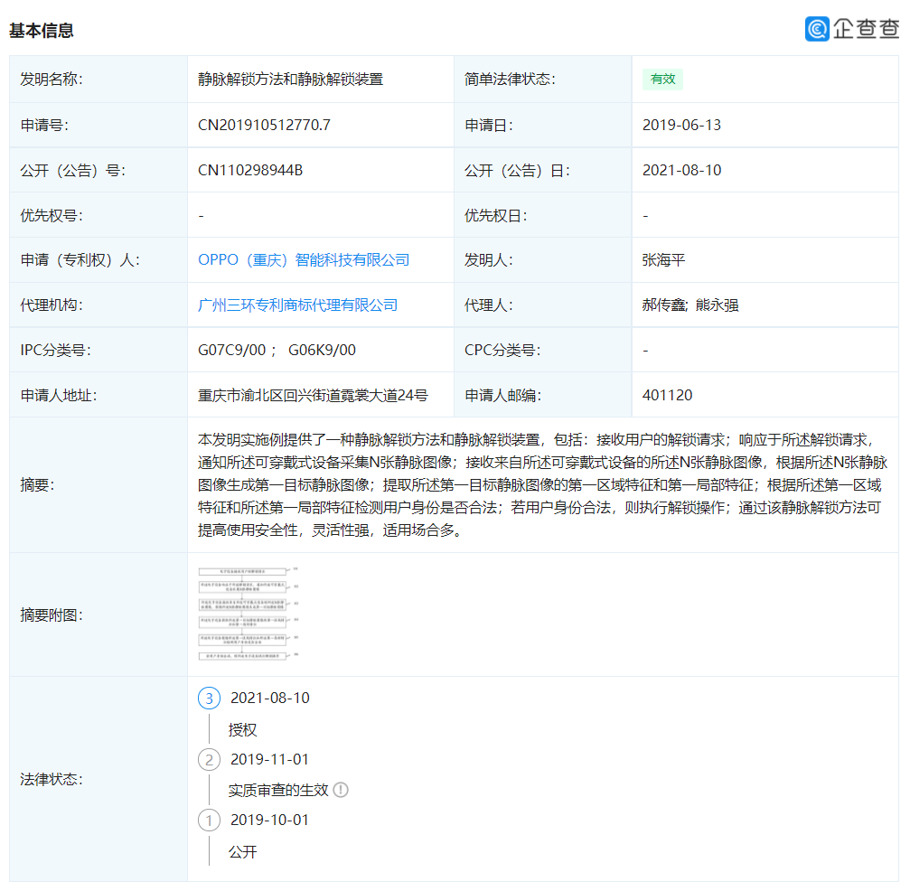 企查查 App 显示,近日,OPPO(重庆)智能科技有限公司获得“静脉解锁方法和静脉解锁装置”专利授权,公开号 CN110298944B,申请日期为 2019 年 6 月。