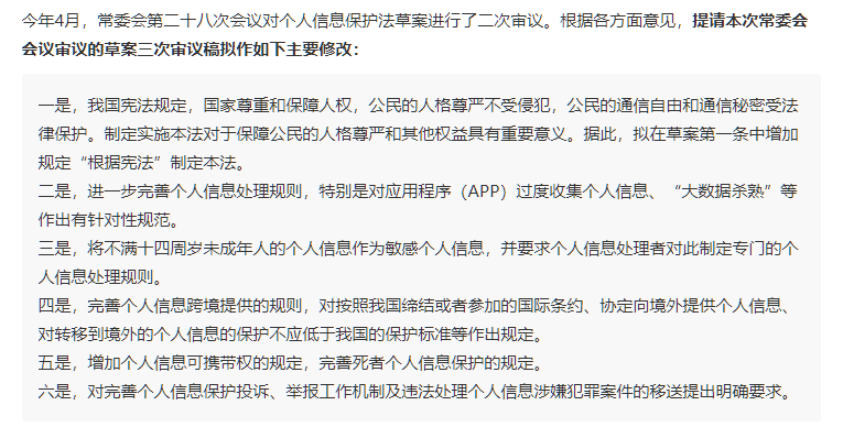 个人信息保护法草案(三次审议稿)即将提请十三届全国人大常委会审议。全国人大常委会法工委发言人臧铁伟 13 日在记者会上介绍了三审稿拟作修改的情况。