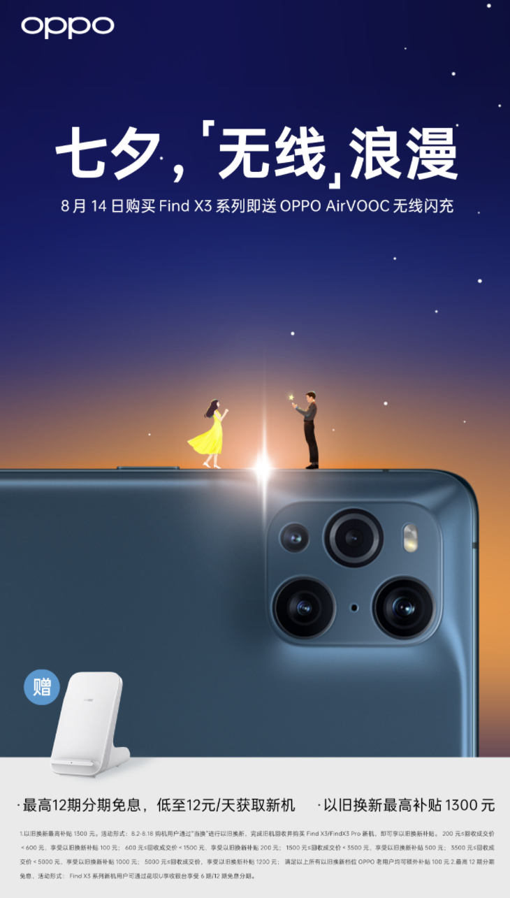 8 月 13 日消息,明日是农历七月初七,是中国传统节日七夕。OPPO 官方微博在今日晚间公布了七夕活动:七夕当日购买 Find X3 系列即送 AirVOOC 无线闪充。“我无线充满,你手机里的浪漫。”