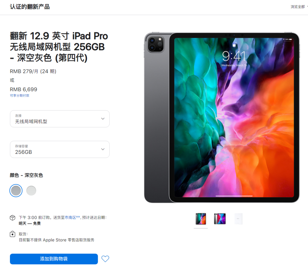 苹果公司此前在美国开始提供第二代 11 英寸 iPad Pro 和第四代 12.9 英寸 iPad Pro 机型的翻新机版本,这些机型最初于 2020 年 3 月发布。现在第四代 12.9 英寸 iPad Pro 机型的翻新机版本也已经上架苹果中国官网商店,其中 256GB 版售价 6699 元。