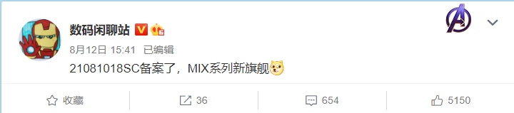 据微博博主 @数码闲聊站 称,MIX 系列新旗舰21081018SC 备案了。