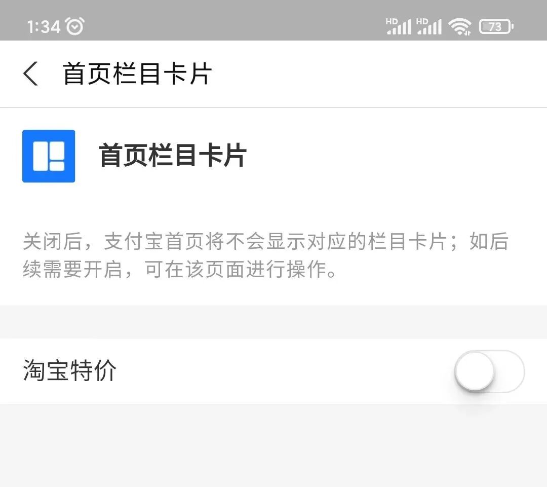 支付宝 App 可关闭首页「淘宝特价」卡片