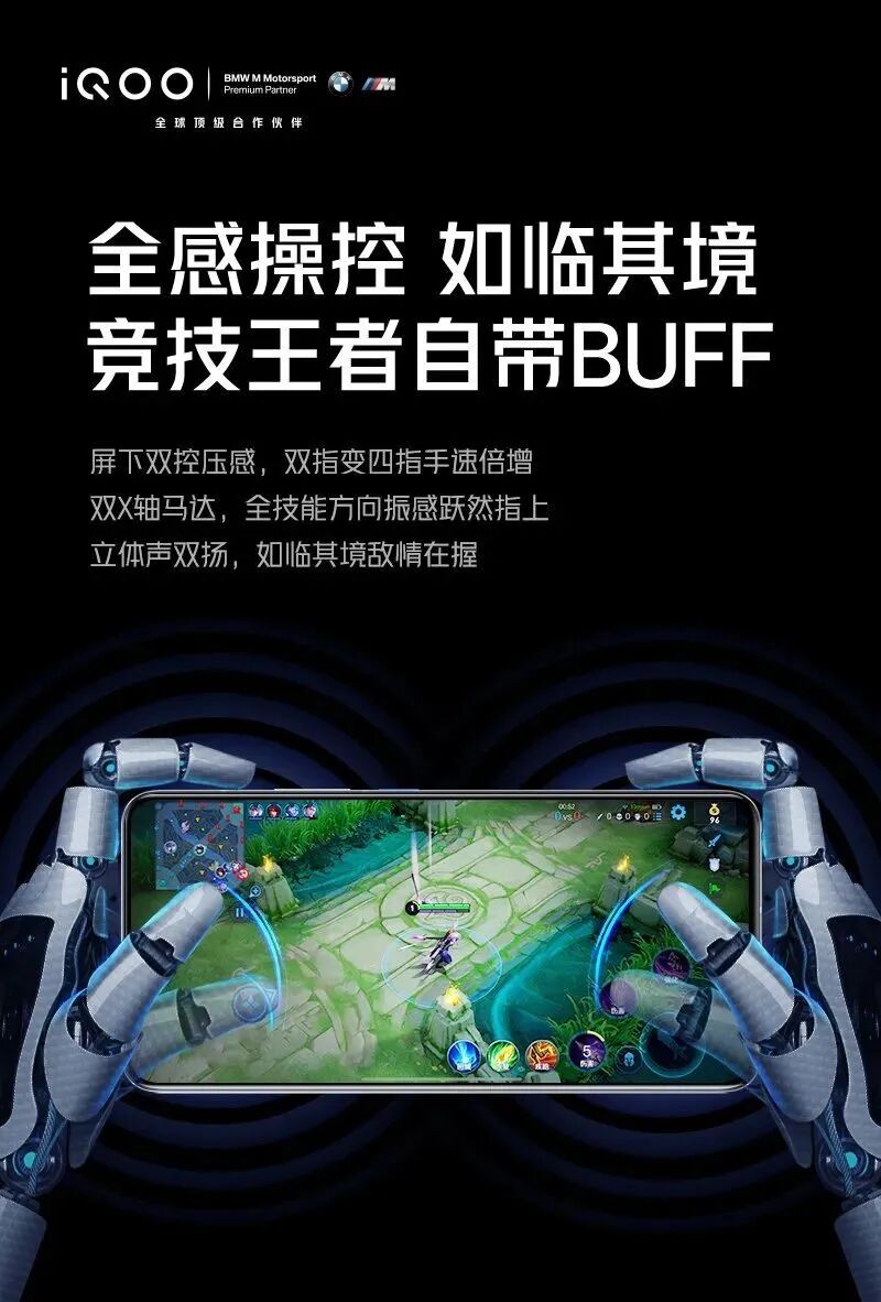 根据海报信息,iQOO 8 支持屏下双控压感技术,可以让双指变四指,官方称在《和平精英》、《王者荣耀》等游戏中,通过该技术可使得多指操作更简单。另外,iQOO 8 还配备了全新的双X轴马达。