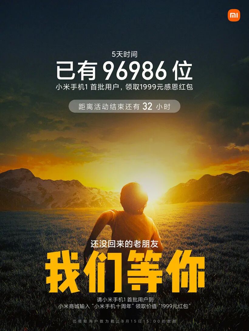已有 96986 位小米首批用户收到 1999 元感恩红包