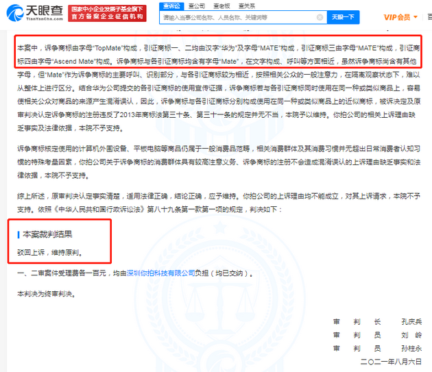 判决书显示,诉争商标为你拍公司2016年申请注册的“TopMate”商标,核定使用商品包括平板电脑、智能手机等。引证商标均为华为公司相关“MATE”商标。