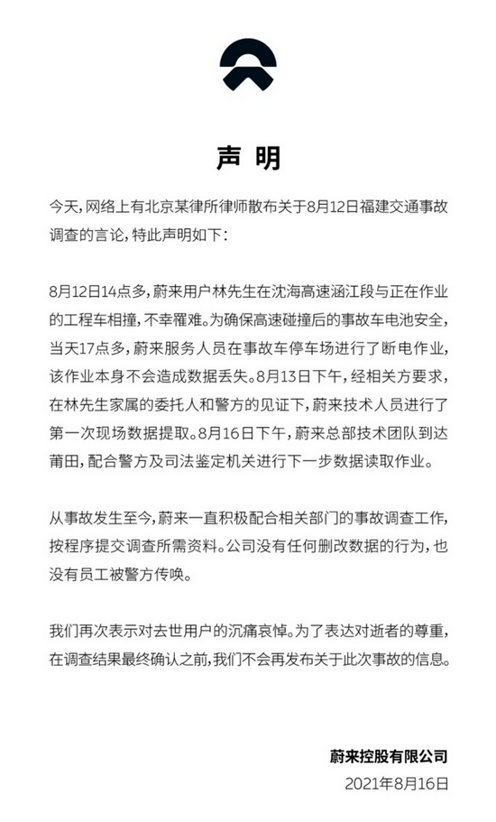 今日,有报道称蔚来技术人员未经交警同意,私自接触涉案车辆进行操作的情况,交警昨日已传唤该蔚来技术人员做笔录。