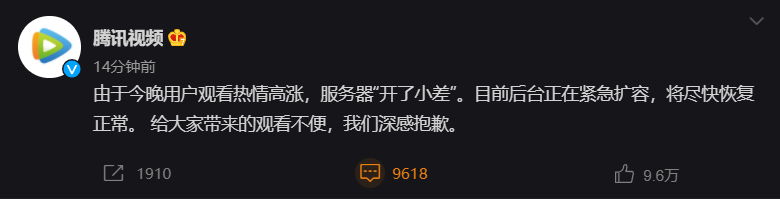 腾讯视频官方表示:由于今晚用户观看热情高涨,服务器“开了小差”。目前后台正在紧急扩容,将尽快恢复正常。给大家带来的观看不便,我们深感抱歉。
