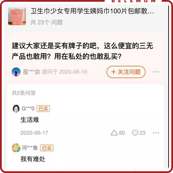 而这些廉价卫生巾真正的买家,在这些问题下面的回复是:“我有难处”。