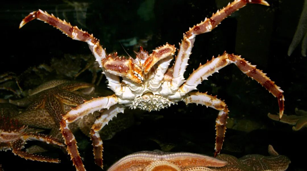 水族箱里的帝王蟹看起来十分威武,这可不是徒有其表,因为在大海之中,它们的确属于顶级掠食者。