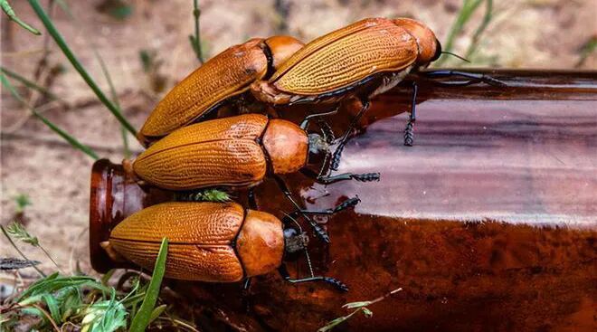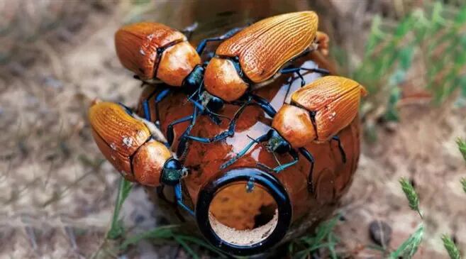 早在1981年的时候,昆虫学家就发现了一件奇怪又有趣的事情,那就是大量的澳大利亚宝石甲虫会聚集在被丢弃的啤酒瓶上,进一步观察后发现,这些在啤酒瓶上爬来爬去的甲虫全部都是雄性。更为有趣的是,即便是在繁殖的季节,有雌性甲虫从啤酒瓶旁爬过,聚集在啤酒瓶上的雄性甲虫也会对其视而不见。这到底是怎么回事呢?为什么雄性澳大利亚宝石甲虫会只爱酒瓶而不理会异性呢?这还要从这种甲虫的繁殖方式说起。