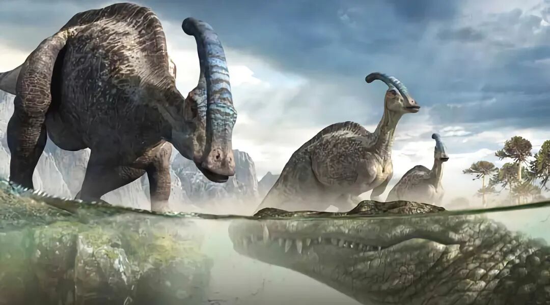 果不其然,这只副栉龙安然吃完了自己的午餐,准备溜达到河边去喝上一杯,就在它低头喝水的时候,一个庞然大物从水中窜出,张开血盆大口咬住了它的脖颈,此时,它唯一能做的事情就是用头上的发生器向它的同伴示警。时光穿梭,岁月流逝,一晃,7000多年过去了。