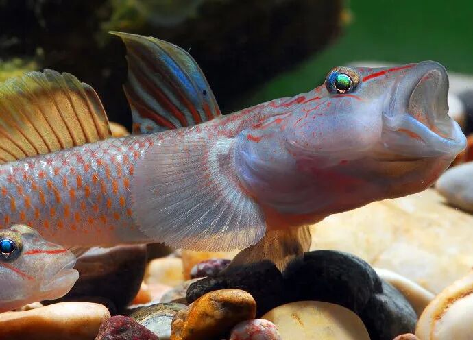 在海洋之中生活着一种小鱼,我们称之为虾虎鱼,虾虎鱼的种类很多,它们也许并不算是游泳高手,但绝对是弹跳大师。虾虎鱼的外形和一般的鱼类有着明显的区别,它们的左右腹鳍能够合在一起组成一个吸盘,当它们使用这个吸盘吸附在礁石上的时候,可以很好地抵御大浪的冲击。所以,每当潮水退去的时候,我们都能够在海边的礁石坑中发现大量的虾虎鱼。虾虎鱼将自己留在这里当然是有目的的,因为潮水退去之后,很多小鱼小虾都会被困于这些礁石坑之中,而这些就是虾虎鱼的美餐。