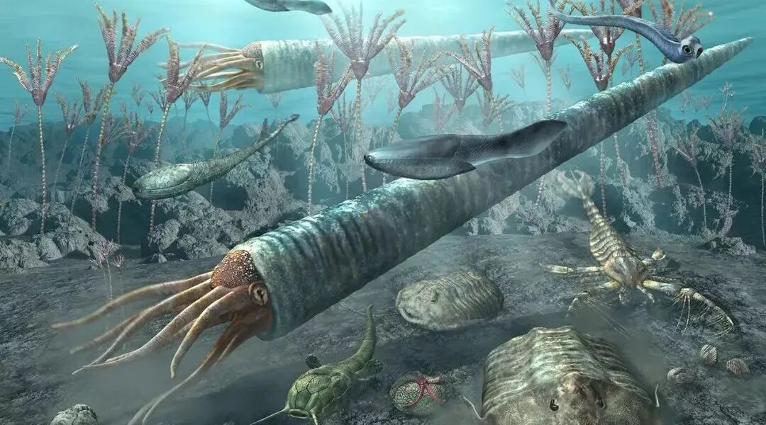 到了奥陶纪时期,软体动物崛起了,于是新一代的海洋霸主出现了,它就是房角石。房角石属于鹦鹉螺类软体动物,外观看上去就像是一只身披甲壳的乌贼。相比奇虾的几丁质甲壳而言,房角石的甲壳可谓是货真价实,在捕食猎物的时候,房角石会使用强有力的触手束缚住猎物,将其推送到嘴部,然后用两颗坚硬的喙将其咬碎。然而攻守兼备的房角石却输在了机动性上,虽是软体动物,但这货的体长达到了惊人的9米,而这就导致了它们转向不便。