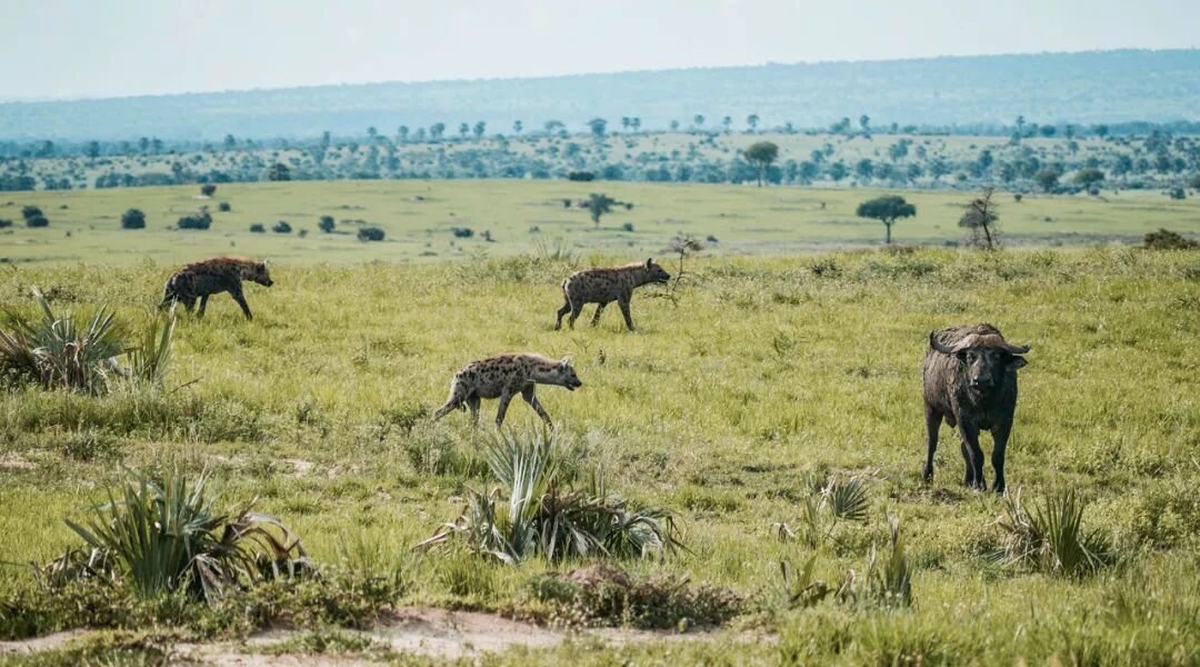 那么问题来了,为什么被咬住肛门的动物都不反抗呢?要知道,被狮子咬住脖颈的野牛还会激烈地反抗,有时候狮子不小心也可能被戳个肠穿肚破,为什么被斑鬣狗咬住肛门后,野牛们却总是乖乖地等死呢?其实不是野牛不想反抗,而是它们已经没有力气反抗了。狮子怎么捕猎?静静地潜伏靠近,然后突然发起攻击,跃到猎物身上,然后咬住脖颈。可见,狮子攻击的猎物都是气力满满的。但斑鬣狗不同,它们并不是潜伏捕猎,而是利用自己强大的耐力来赶逐猎物,直至猎物气力耗尽。