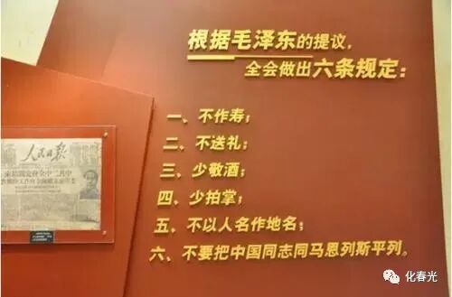 可大家议论纷纷,说法不一,又将毛主席和朱总司令的画像挂在两旁,结果再次受到毛主席的严厉批评。就这样,毛主席提出了“六不”规定,这些规矩虽然没有写进会议决议,但已经成为共产党人日常的行为准则。