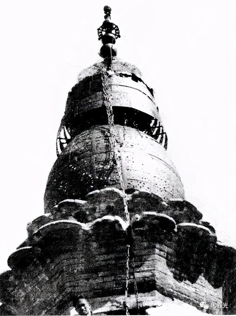 为了拍摄应县木塔的细节,梁思成爬到楼顶,一只手抓住塔尖生锈的铁索,另一只手不断按下相机快门。这时,突然响起了一声惊雷,梁思成吓得浑身一抖,差点失手掉下去。可以说是冒着生命危险,拍下了塔尖的珍贵照片。