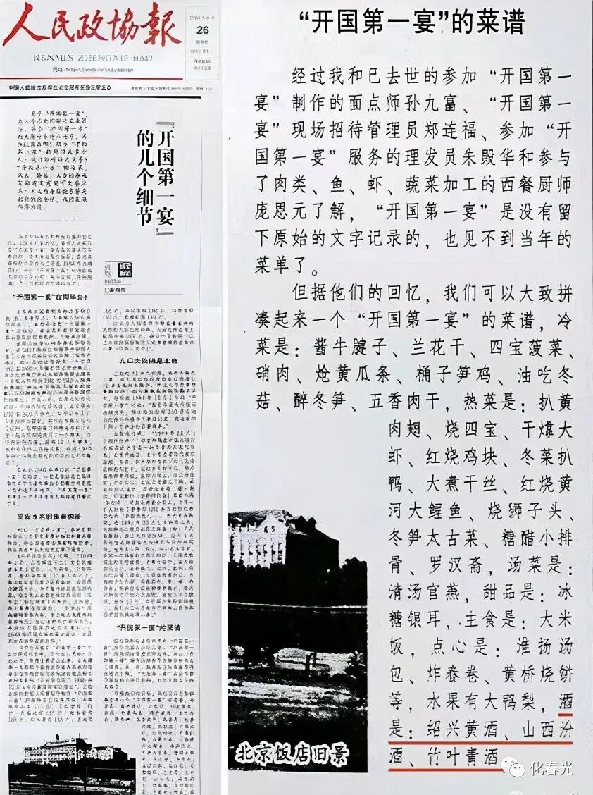 第一国宴的用酒原本很明确,从1949年9月21日第一次全国政治协商会议开幕,到开国大典之日,一共举办了三次国宴。《人民政协报》在介绍开国第一宴时,明确表示:三次国宴,使用的酒均是山西汾酒、竹叶青酒及绍兴黄酒。
