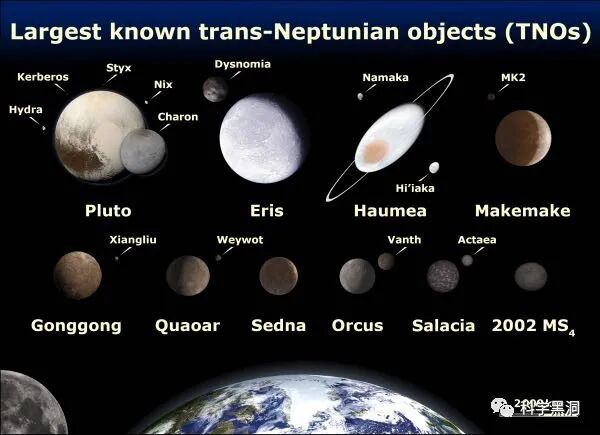 冥王星的出现一直都备受争议,因为科学家发现越来越多的外海王星天体,冥王星的地位受到挑战。下边图片中就聚集了比较著名的外海王星天体,包括冥王星、阋神星、妊神星、鸟神星、共工星等等。2006年8月国际天文联合会对“行星”进行了重新的定义,冥王星至此被降级成为矮行星。