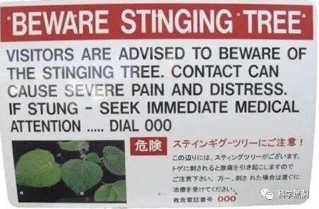 其实对于植物来说它们也有自己独特的本领,但大多数体现在如何进行种子传播上,利用某些特性吸引更多的小动物前来帮助传播种子好遗传后代。但地球上有这样一类植物,它们堪称世界上最痛的植物。大家看见过森林山地旁的警示标识,大多数都是提醒注意某些危险常出没的肉食动物,但在澳大利亚昆士兰州你会看到这样的提醒“刺树会导致严重的刺痛,不小心接触后需紧急救治”。