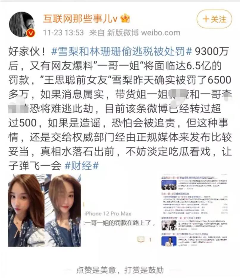 网上已经有各种流言在飞,比如说“带货一哥”和“带货一姐”或将面临6.5亿的罚款。