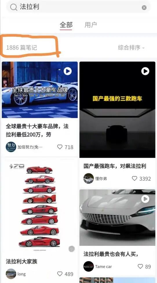 如今,我们在小红书再输入“法拉利”,仅剩下1886篇笔记了,水分一挤就挤掉了80%。