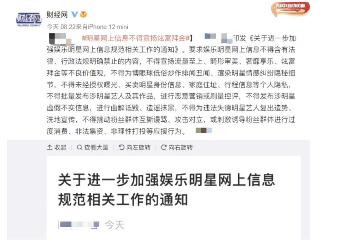 这两天一份通知下发,目标是娱乐明星们,白纸黑字写着:明星不得宣扬奢靡享乐、炫富拜金等不良价值观。