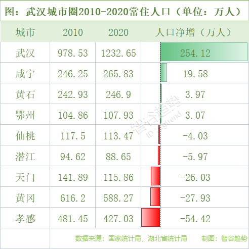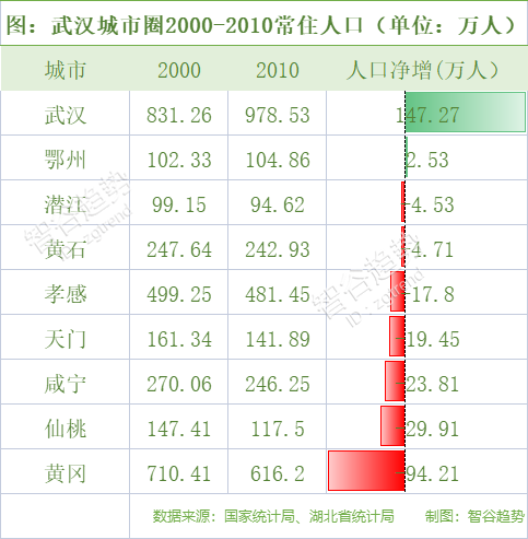 从2000年-2010年,武汉都市圈九个城市当中,除了武汉和临近的鄂州之外,其他7个城市均呈现人口净流出的局面。