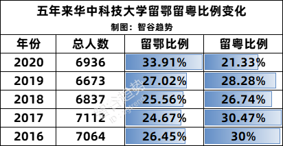 今年,华中科技大学本科毕业生的留鄂留粤比例彻底扭转,留鄂比例从2016年的26.45%增至33.91%,而留粤比例则从30%降至21.33%。