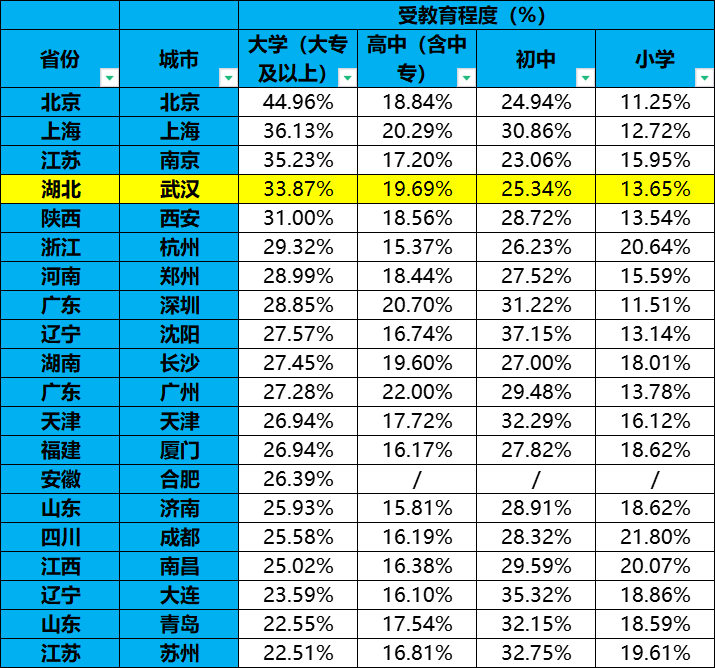 不仅如此,武汉的人口结构中,本专生的比例占到了33.87%,位列全国第四,超越了广深两城,仅次于北京上海南京之后。