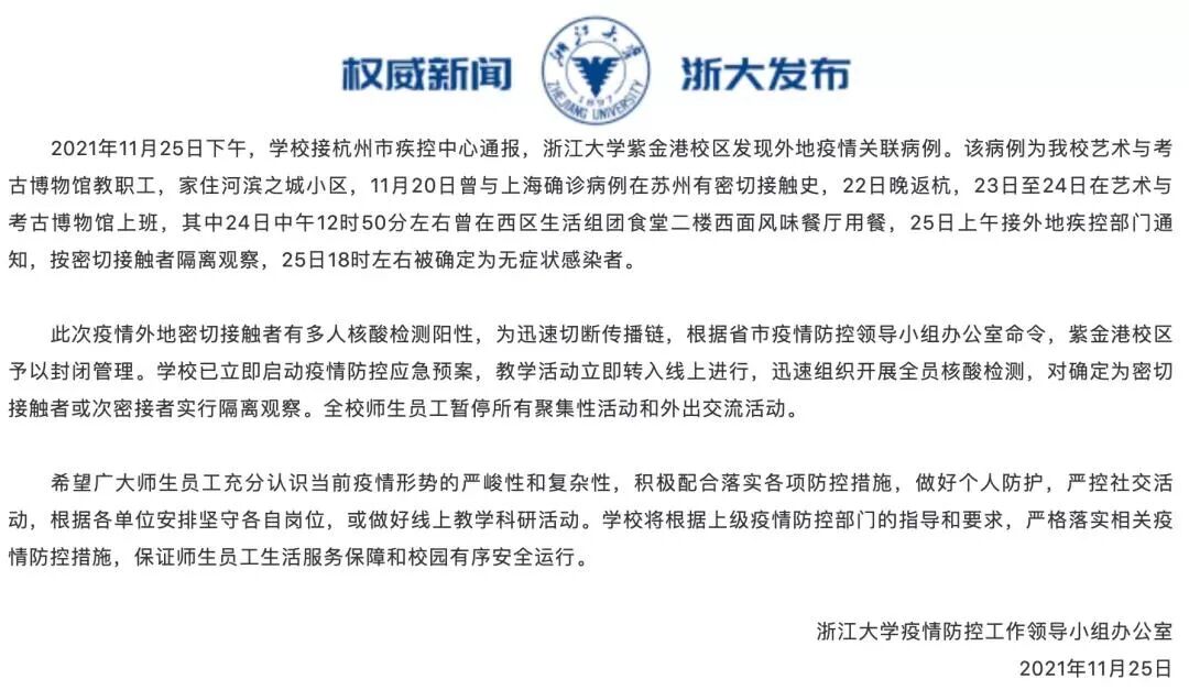 浙江大学艺术与考古博物馆教职工11月25日被确定为无症状感染者。经查,此人11月20日曾与上海确诊病例在苏州有密切接触史。