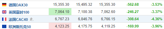 下午开盘的欧股跌得更惨,欧元区斯托克50指数期货跌近4%,法国CAC40指数日内跌幅更是超过4%。
